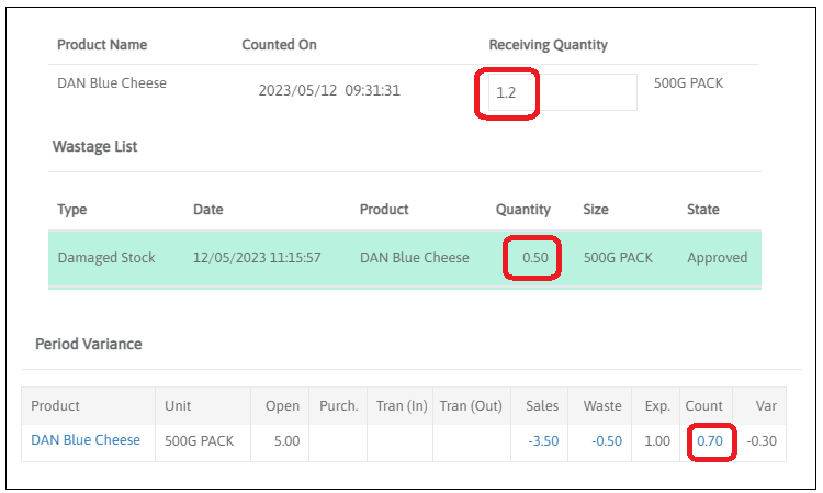 In the example below, a count of 1.2 packs is entered at 9:31am. A stock movement of -0.5 packs is entered at 11:15am, therefore the count in the period (which ends at 11:59am) is adjusted to 0.7.