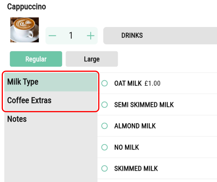 For example, below the Cappuccino has a two modifiers: a 'Milk Type' modifier, and a 'Coffee Extras' modifier, which you can pick between in the left hand column.