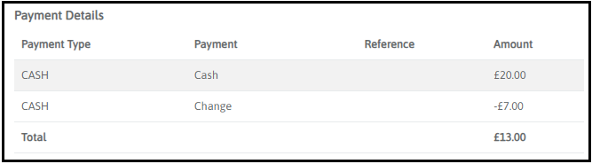 Additionally, for cash payments, cash is no longer displayed under one consolidated line. Instead, it is now broken down into multiple lines (where applicable) displaying cash declared at the POS and change.