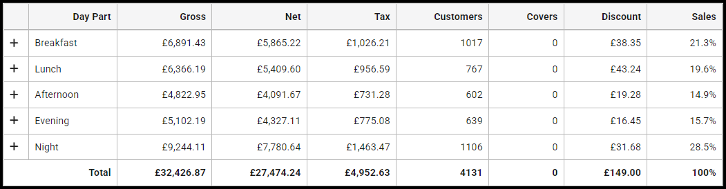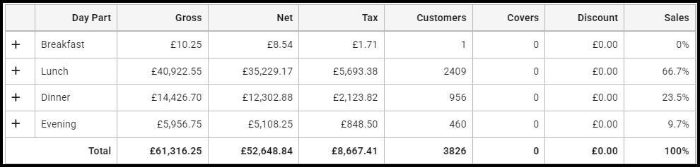 | Covers | Displays the number of covers against the day part, if assigned. |