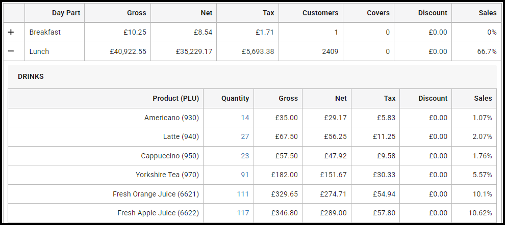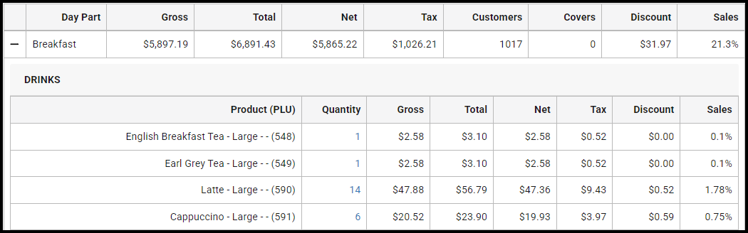 When report filter Analysis Style "Product" is selected, the first level of the report summarises key sales metrics by day part, split into sections based on the View Type and Split By Sales Date filter options selected.