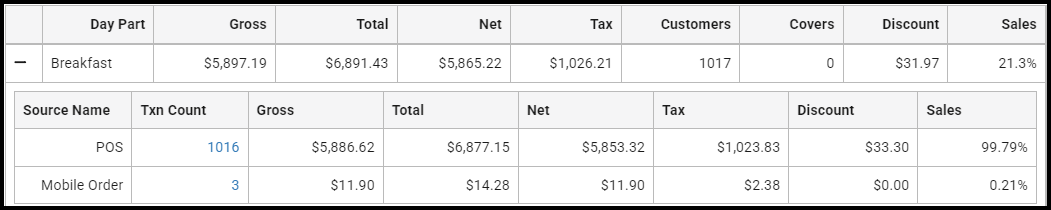 When report filter Analysis Style "Transaction Source" is selected, the first level of the report summarises key sales metrics by day part, split into sections based on the View Type and Split By Sales Date filter options selected.