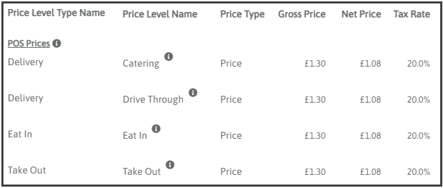 The price of £1.30 is represented against all NCR POS price levels in Centegra Plus:
