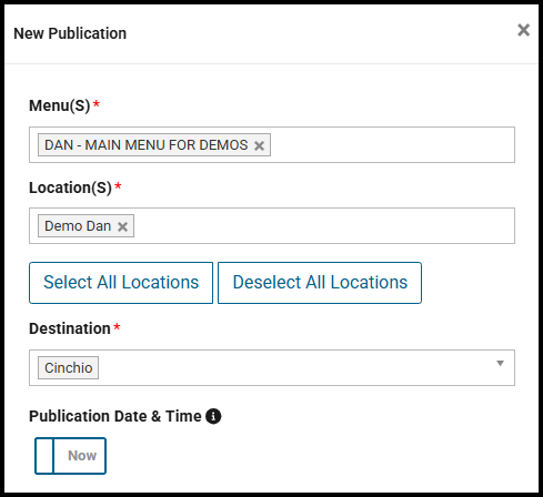 To support immediate publication of menus across multiple time zones, when publishing menus you're now prompted whether or not you want to publish the menu now or in the future.