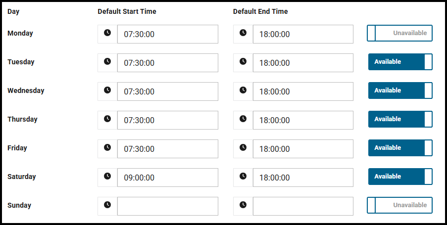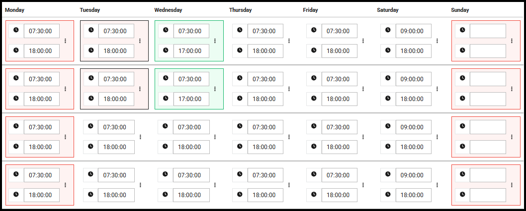 Within a menu, Default Menu Times are now defined per day of the week to reduce the need for Menu Timing Overrides when opening hours differ at the weekend, for example.