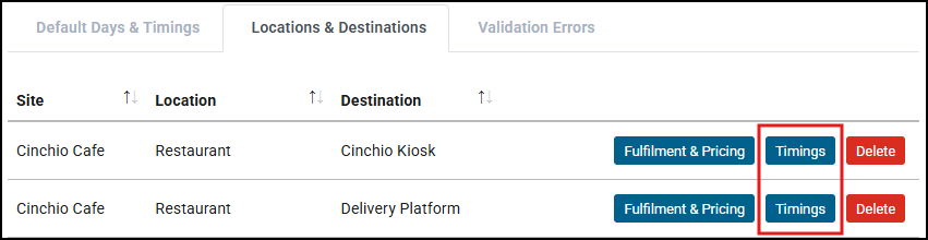 If you're in the menu and need to apply Menu Time Overrides for a specific location and destination, click through the [Timings] button in the Locations & Destinations tab and this will take you into the Menu Timings section filtered to your selected menu, location and destination.