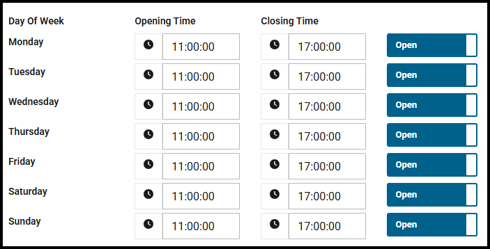 Note that Site Opening Hours will only decrease the time that a menu is available; they will not make a menu available outside of the Default Menu Hours.