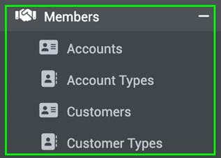 - Members: Now grouped under a single heading. Previously located under "Configuration" with sub-items like Accounts, Account Types, Customers, and Customer Types.