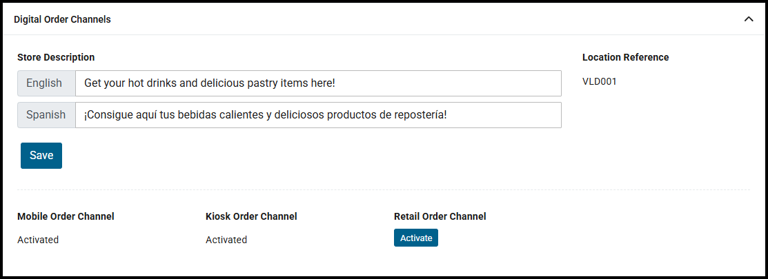 Order channels are listed beneath with visibility of whether the channel is already activated for this location. For details on activating a new order channel, see Digital Order Onboarding.