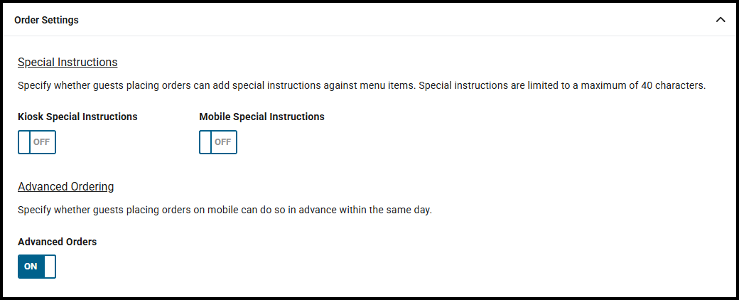- Advanced Orders: Select whether customers can place mobile orders for a later time within the same day.