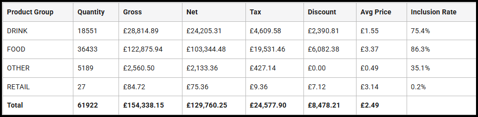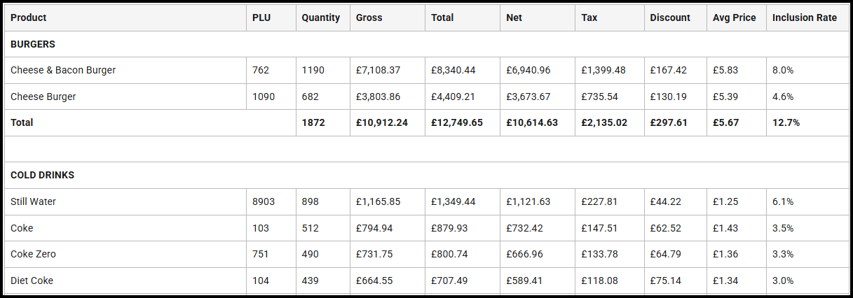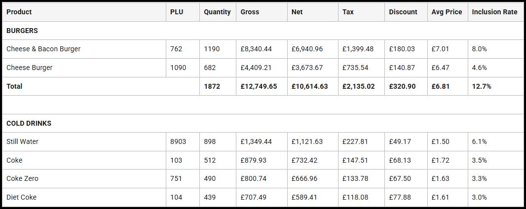 | Inclusion Rate | Displays the percentage of total transactions in this section (per the View Type filter option) that products within this group have been sold in. |