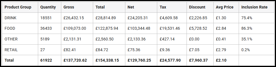 | Gross | Displays the total net sale value of products assigned to this group, before discount is applied. |