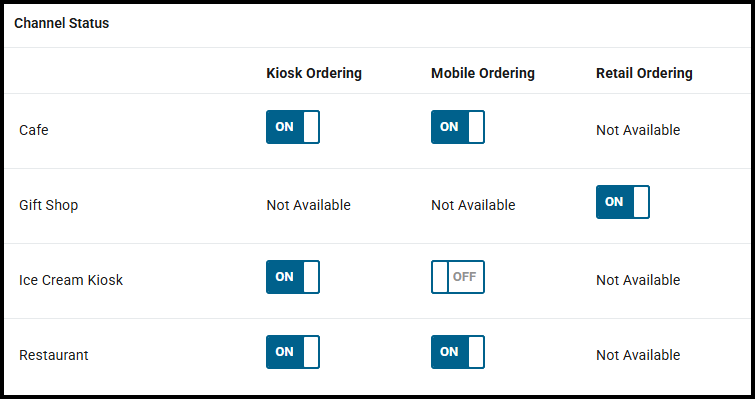 Each location within your site is listed, with the option to turn Digital Ordering on or off against each channel where available.