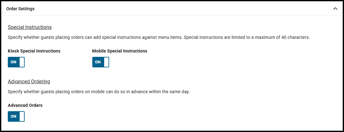 You can manage which settings users within your company will see when accessing the Digital Ordering location setup section via Digital Order Management > Advanced Settings > Location Setup.