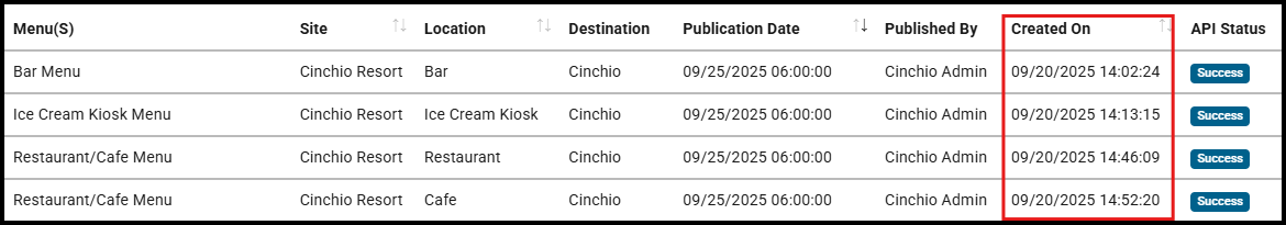 When a menu publication is created, the time that it was created is now captured alongside the user that created it, to help in locating menus scheduled to publication across time zones, or scheduled for future publication.