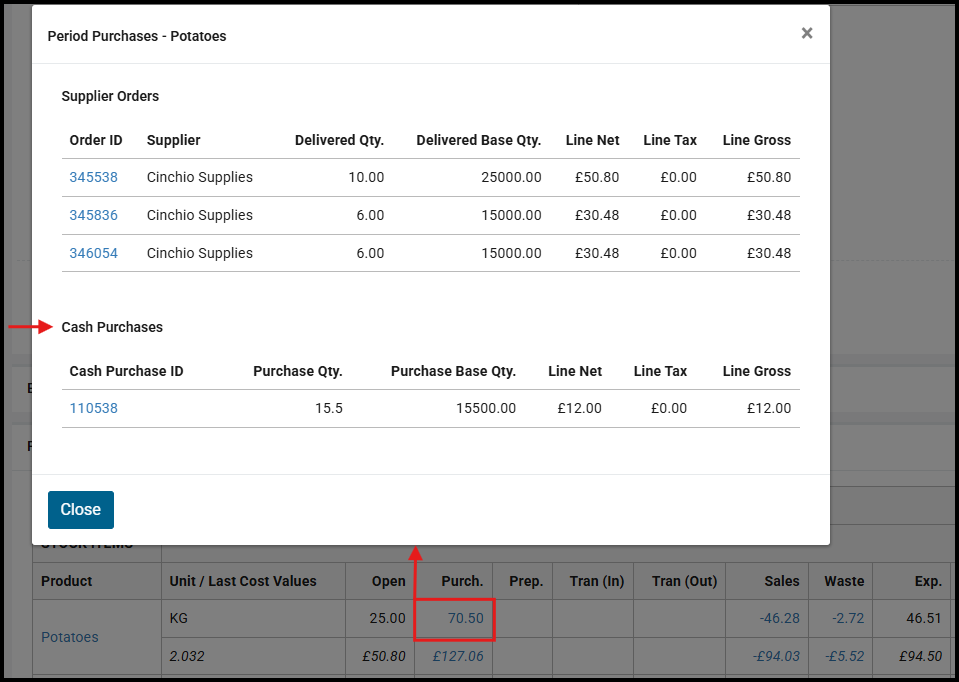 Within the Period Variance report, Cash Purchases are now listed within the Period Purchases window for each product.