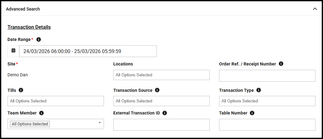 | Till(s) | Search for transactions against specific tills within the selected site or, if applied, selected location. |