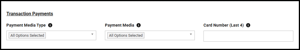 | Payment Media Type | Search for transactions containing payment media assigned against a selected payment media type. |