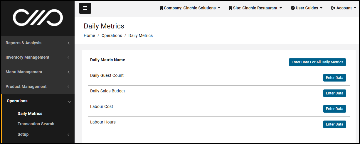 Following the introduction of the Transaction Search feature covered above, the Daily Metrics data entry feature has been relocated within the main menu and is now access via Operations alongside other operational tools and features.