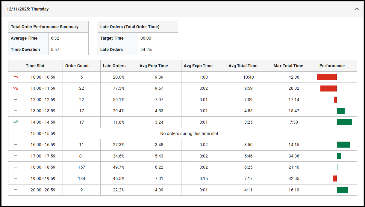 Understand how prep times shift across key time periods to identify peaks, bottlenecks, and delays: