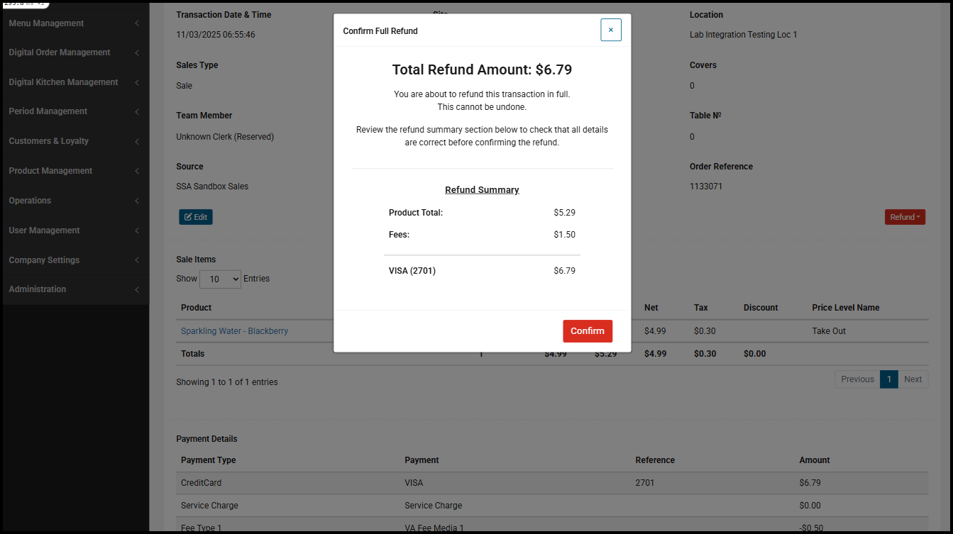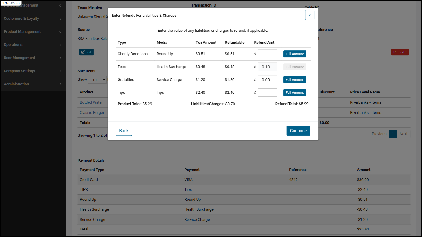 Refunds can be enacted for the entire transaction to refund all products, liabilities and charges, returning the full amount to the customer: