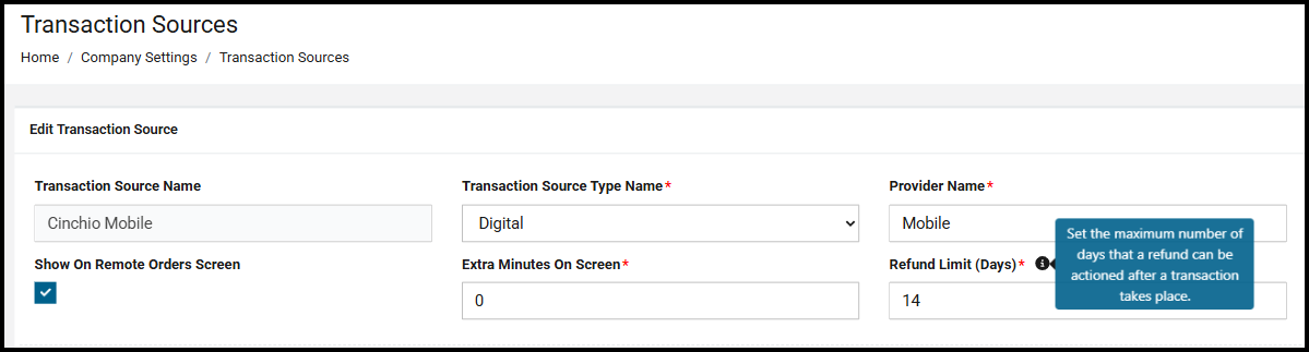 Against a transaction source enabled for refunds (by Cinchio admin), against the Refund Limit you can specify how old transactions can be to be eligible for refunds, between 1 and 30 days. (Default is 7 days.)