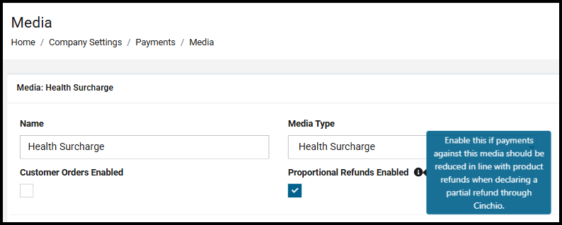 If a media type is flagged as Used For Liabilities or Used For Retained Charges, media assigned to that media type can be flagged for Proportional Refunds Enabled, meaning that in partial refunds the liability/charge will be automatically proportionally refunded in line with the product value being refunded.