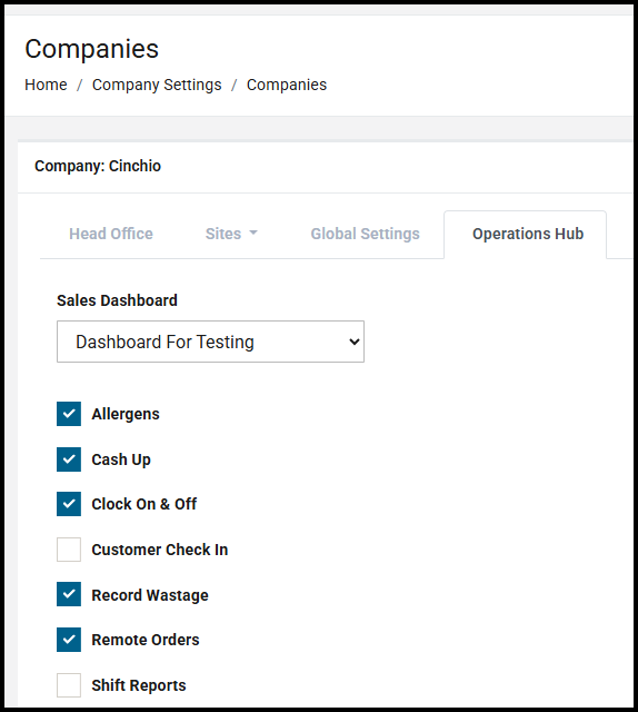 Finally, restricts can be applied on which FOH tools are available within the Operations Hub for all locations across the company.