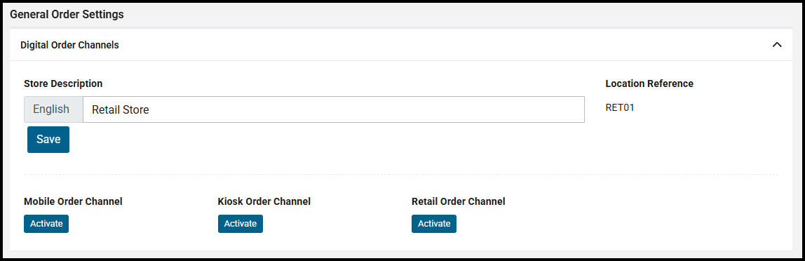 - In the Digital Order Settings section, against Retail Order Channel select [Activate].