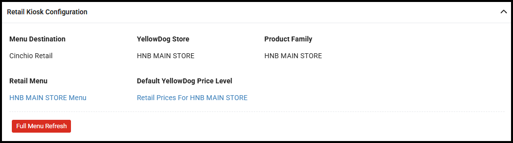 On confirmation, the YellowDog integration will be enabled for this store and data till start to populate behind the scenes. This process should take no more than 5 minutes, after which, you can publish the menu for the first time to publish for the first time using the [Full Menu Refresh] button within the Retail Kiosk Configuration section.