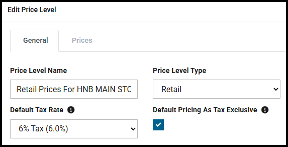 The price is linked to a Cinchio Price Level specific to your store, and the tax rate is inherited from that prices levels Default Tax Rate setting, which can be adjusted for individual products if required. (See the Product Prices & Tax section later in this article.)