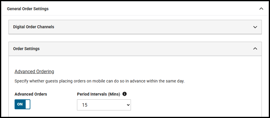 Via Digital Order Management > Advanced Settings > Location Setup, if Advanced Orders are enabled for Mobile Ordering, you can now customise the advance order intervals that customers select when placing orders for later in the day.