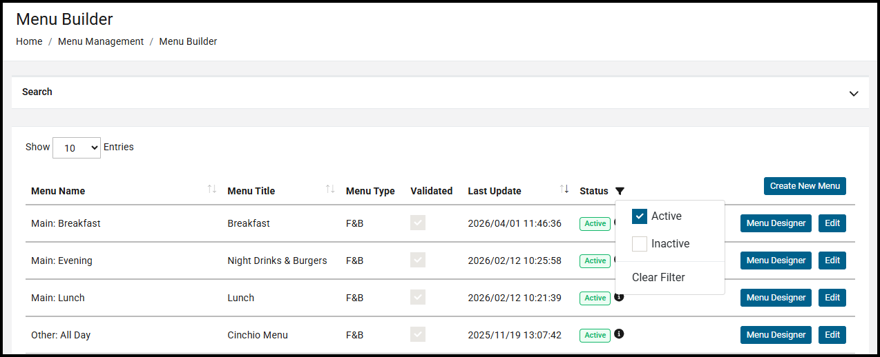 Within the Menu Builder section, you can now filter the Status column to see all menus or just those which are currently active.