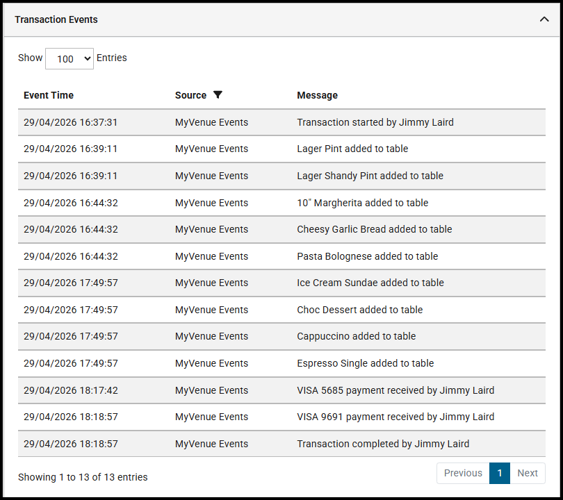 Within transactions received from MyVenue POS, within the Transaction Events section we now expose the following actions performed on the POS: