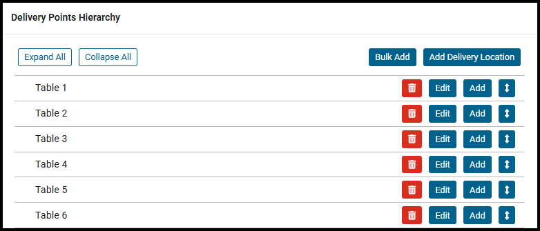 Accessed via Company Settings > Site Setup > Delivery Points, you can now configure Delivery Points against your site to represent tables available within locations in your site, and to represent onsite delivery locations available throughout the site.