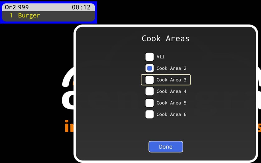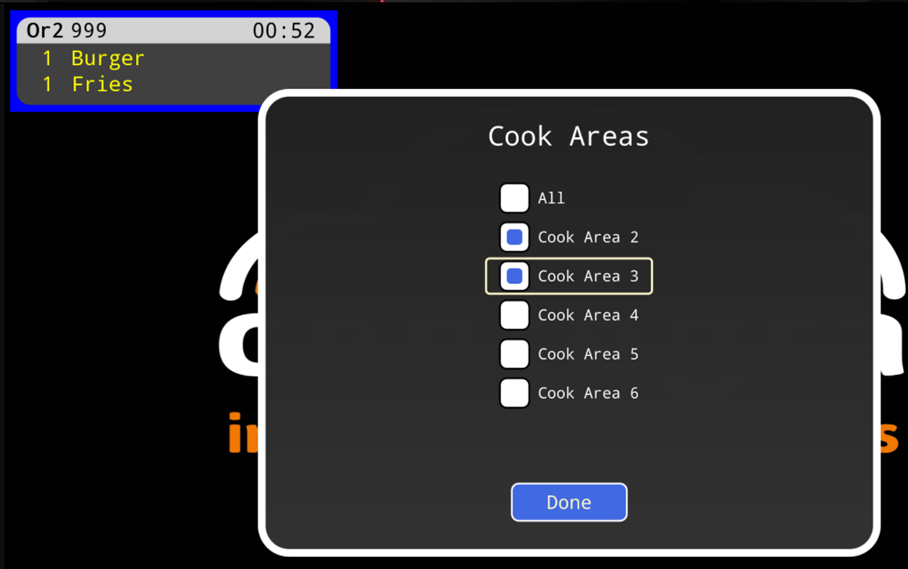 You have the ability to combine multiple cook areas on one kitchen monitor screen, this can allow the users to adjust the flow on the kitchen by increasing or decreasing which cook areas show on different screens. This can also be used when kitchen staff is reduced at certain times of the days and all orders are able to be prepared using one screen.