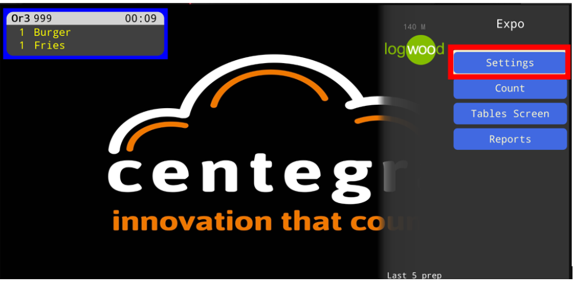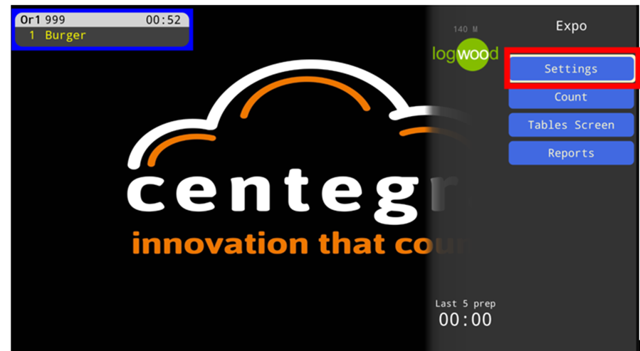 To access the cook area, to press MENU on the bump bar or if using a touchscreen device touch on the Logwood logo on the right column. You should see the setting option which you will need to select, press SHOW on the bump bar to select or touch the setting button if using touch screens.