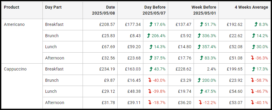 The Item Like-for-Like report lets you compare product sales at your site with past performance. For a selected date, see how sales measure up against the previous day, the same day last week, and a four-week average. Sales are grouped by Reporting Day Part, giving you a clear, structured view of trends. Use these insights to track performance and make informed business decisions.