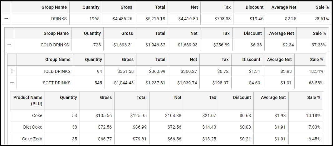 The final level of the report breaks down individual products sold within the selected product group.