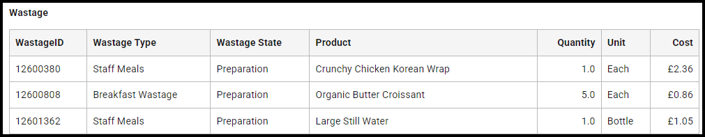 | Quantity | Displays the quantity of the product wasted based on the Unit size shown. |