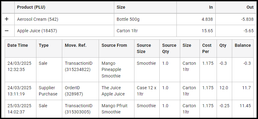 | Source From | Displays the original product that generated the movement. This may be the current product itself, or a recipe containing the current product. |
