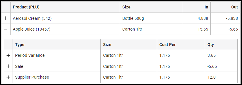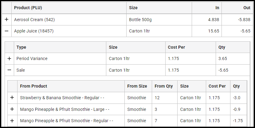 When report filter Analysis Style "Summary With Drill Down" is selected, the third level of the report summarises the movement totals based on the source product, where applicable.