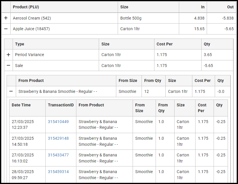 When report filter Analysis Style "Detailed Full Transaction List" is selected, the second level of the report is a list of individual stock movements in chronological order for the selected product.