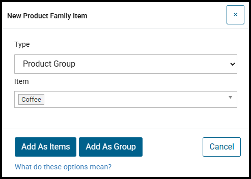 - For example, if you select a specific product group, the products within that product group are added as individual products to the product family. This lets you remove individual products in that group from the family if needed.