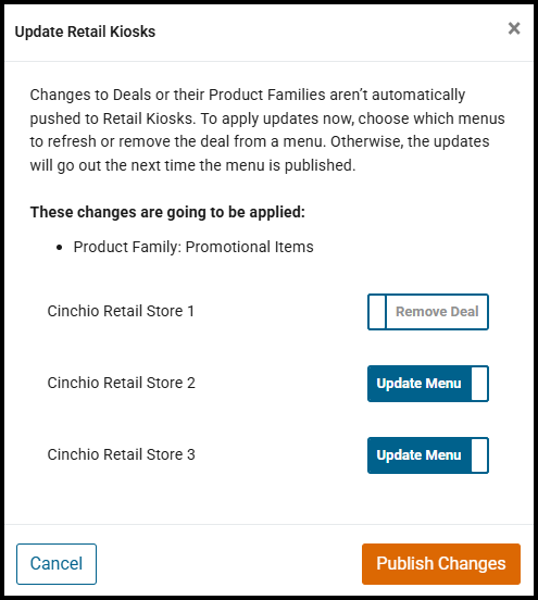 If the product family is used by a deal that is associated with a retail menu currently live on a retail kiosk, then it is possible to push changes down to the kiosks via a Delta Menu Publication now.