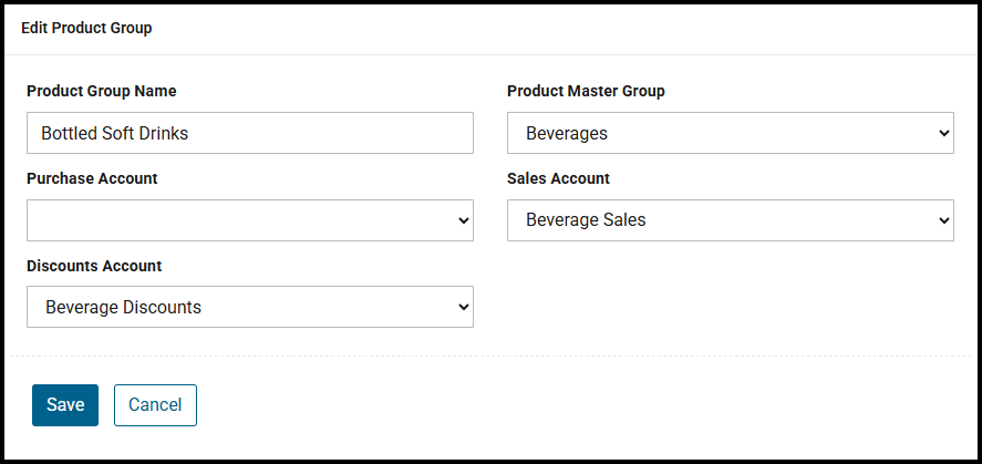 - Purchase Account: Displays the purchase account assigned to the product group, if applicable.
