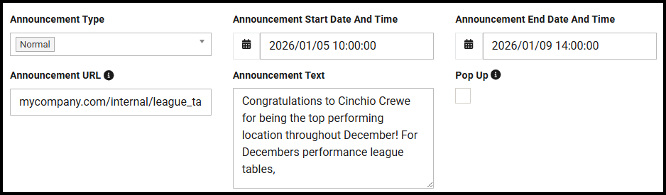 - Announcement URL: If required, enter the URL of a web page that can be accessed via the announcement via a "Click here to read more" link.
