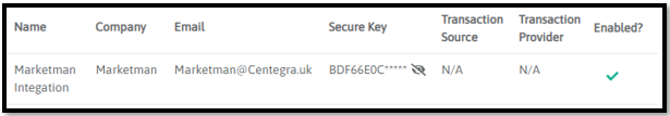 - Locate Marketman in the list, and check that the API key is enabled. (For more details, Click Here.)